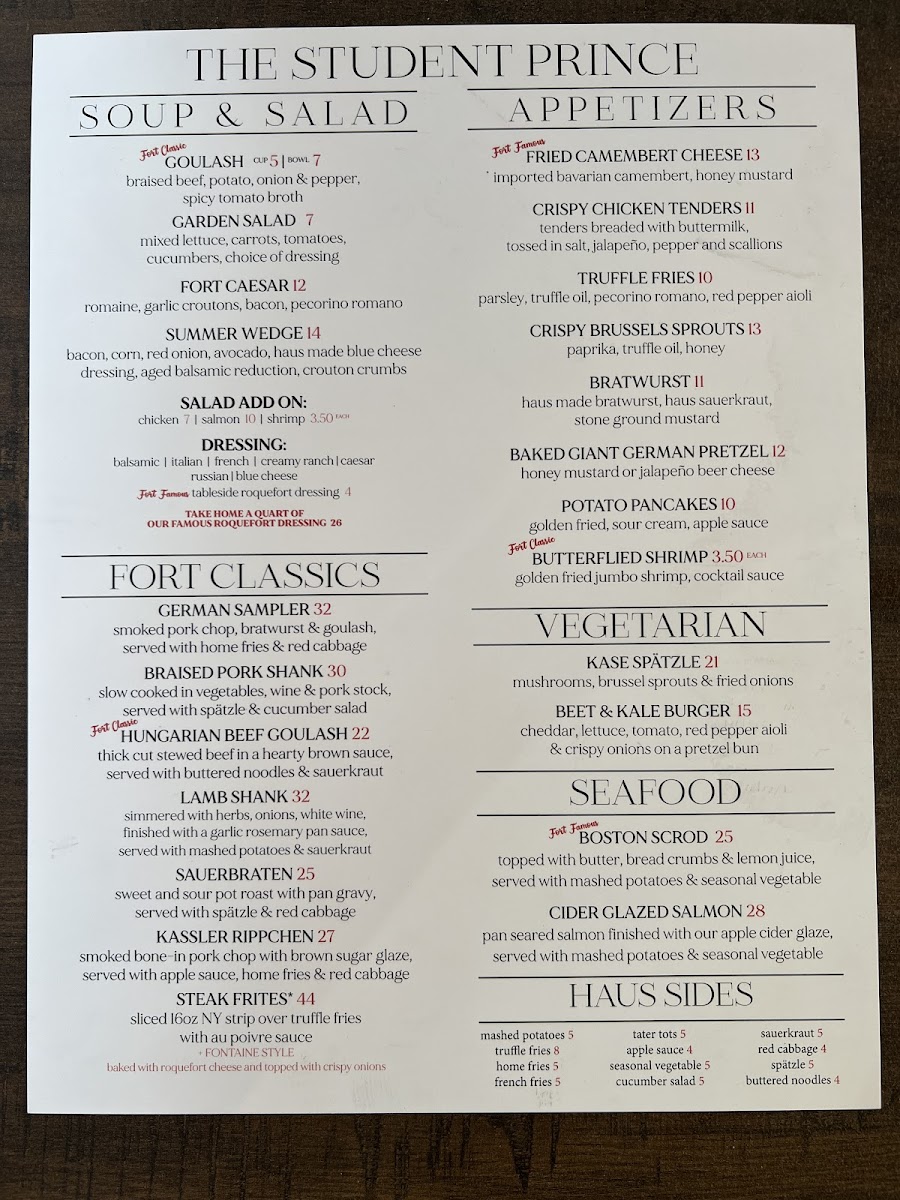 At the heart of Springfield, you'll find a cozy and inviting spot to satisfy your cravings - Student Prince Cafe And The Fort Menu. This beloved local gem brings together hearty German-inspired dishes and a warm, casual atmosphere that feels like home. Whether you're in the mood for a classic bratwurst, a savory schnitzel, or just a delicious plate of pretzels, their diverse menu has something for everyone. The relaxed, inviting vibe is perfect for enjoying a meal with friends or family, making it a great choice for any occasion. With everything from traditional comfort foods to a few modern twists, it's easy to see why this place has earned its reputation as a Springfield favorite.